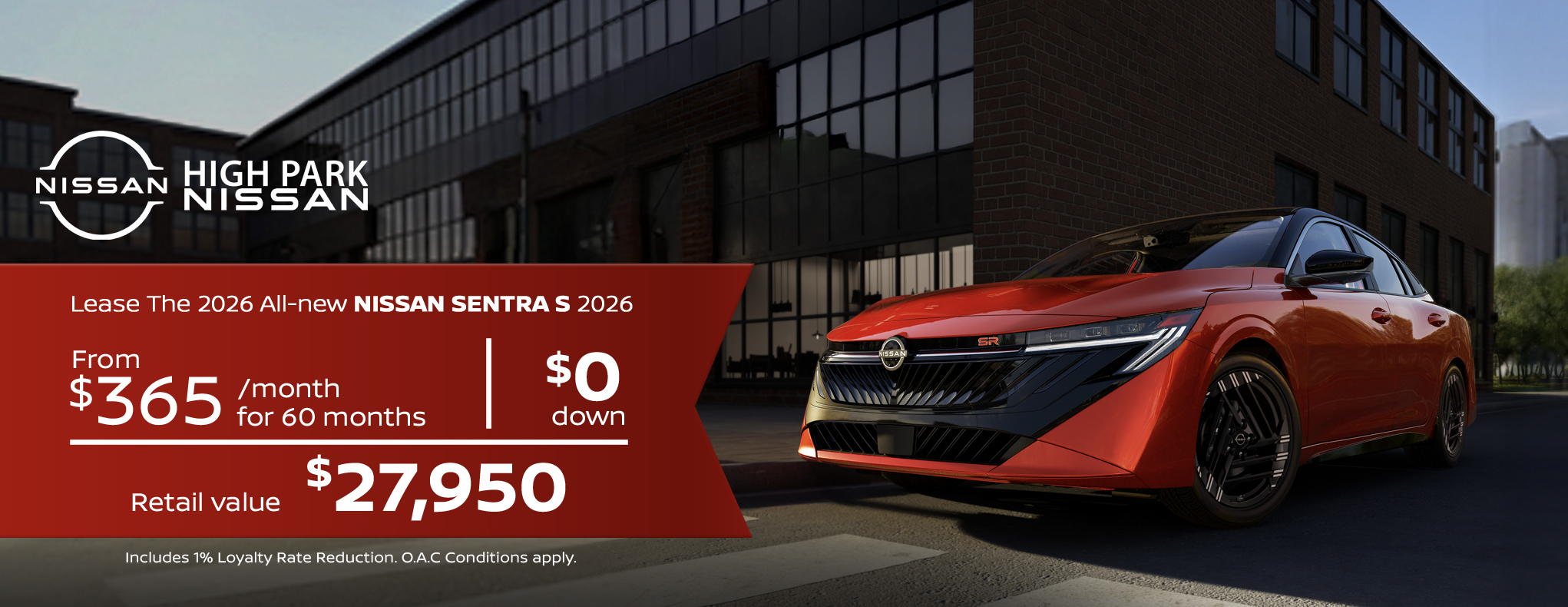 Sentra Plus: [*] Offers available from February 3, 2026 to March 2, 2026. Payments cannot be made on a weekly basis, for advertising purposes only.*Representative monthly lease offer based on a new 2026 LEAF S PLUS at 0% APR for 60 months equals monthly payments of $ 482 with $ 999 down payment, and $0 security deposit. Lease based on a maximum of 16,000 km/year with excess charged at $0.10/km. Total lease obligation is $ 29,983. Lease Bonus of $ 1000.0 is included in the advertised offer.License, registration, insurance and applicable taxes are extra. Offers are available on approved credit through Nissan Canada Finance for a limited time, May change without notice. Retailers are free to set individual prices. Vehicles and accessories are for illustration purposes only.Retailers are free to set individual prices. Vehicles and accessories are for illustration purposes only. Maximum combined electric vehicle (“EV”) incentives of up to $ 0 (deducted after taxes) are only available to eligible residents of Quebec on the purchase or lease (term of 60 months or more) of a new and previously unregistered 2026 LEAF model from a participating Nissan dealer in Quebec between February 3, 2026 to March 2, 2026 (or until the available funds are exhausted), and consist of (i) up to a 0 Quebec government “Roulez vert” incentive; and (ii) up to a 0.00 federal incentive from the Zero-Emission Vehicles Program (iZEV) (tax inclusive). For all incentives: the maximum incentive amounts vary according to lease terms; shorter terms are eligible for lesser incentive amounts. Offers cannot be combined with certain other offers and are provided on a first-come, first served basis until available funds are exhausted. Limit of one federal incentive credit per person per calendar year. See canada.ca/zero-emission-vehicles and quebec.ca/en/transports/electric-transportation/financial-assistance-electric-vehicle/about-roulez-vert-program for program details and conditions. EV incentives May be subject to change without notice and are subject to eligibility terms and conditions. Nissan Canada is not responsible for amendments to any government incentive programs and makes no representations about the actual amount or eligibility for a government incentive. EV incentive information is provided for information purposes only.