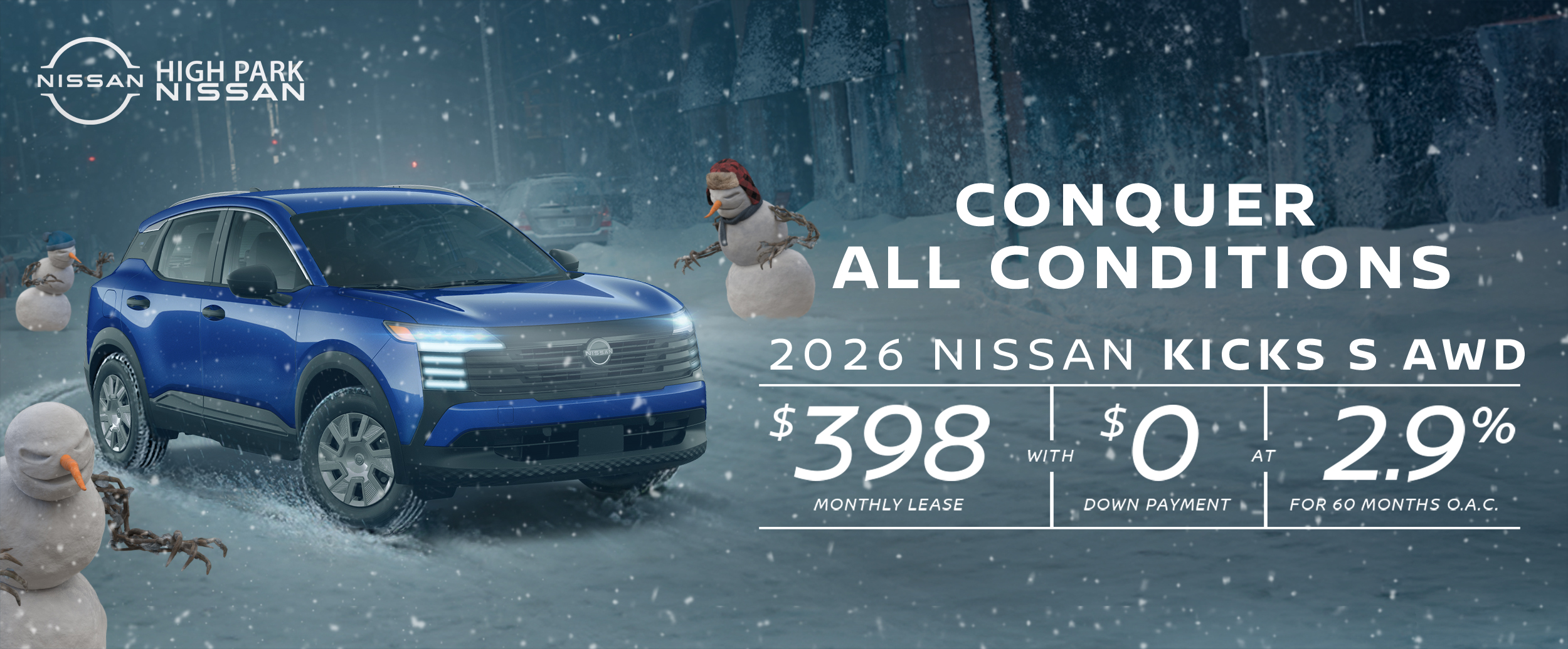 Kicks S FWD: [*] Offers available from February 3, 2026 to March 2, 2026. Payments cannot be made on a weekly basis, for advertising purposes only.*Representative monthly lease offer based on a new 2026 KICKS S FWD at 2.9% APR for 48 months equals monthly payments of $ 348 with $ 1995 down payment, and $0 security deposit. Lease based on a maximum of 16,000 km/year with excess charged at $0.10/km. Total lease obligation is $ 18,751. Lease Bonus of $ 0 is included in the advertised offer.License, registration, insurance and applicable taxes are extra. Offers are available on approved credit through Nissan Canada Finance for a limited time, May change without notice. Retailers are free to set individual prices. Vehicles and accessories are for illustration purposes only.