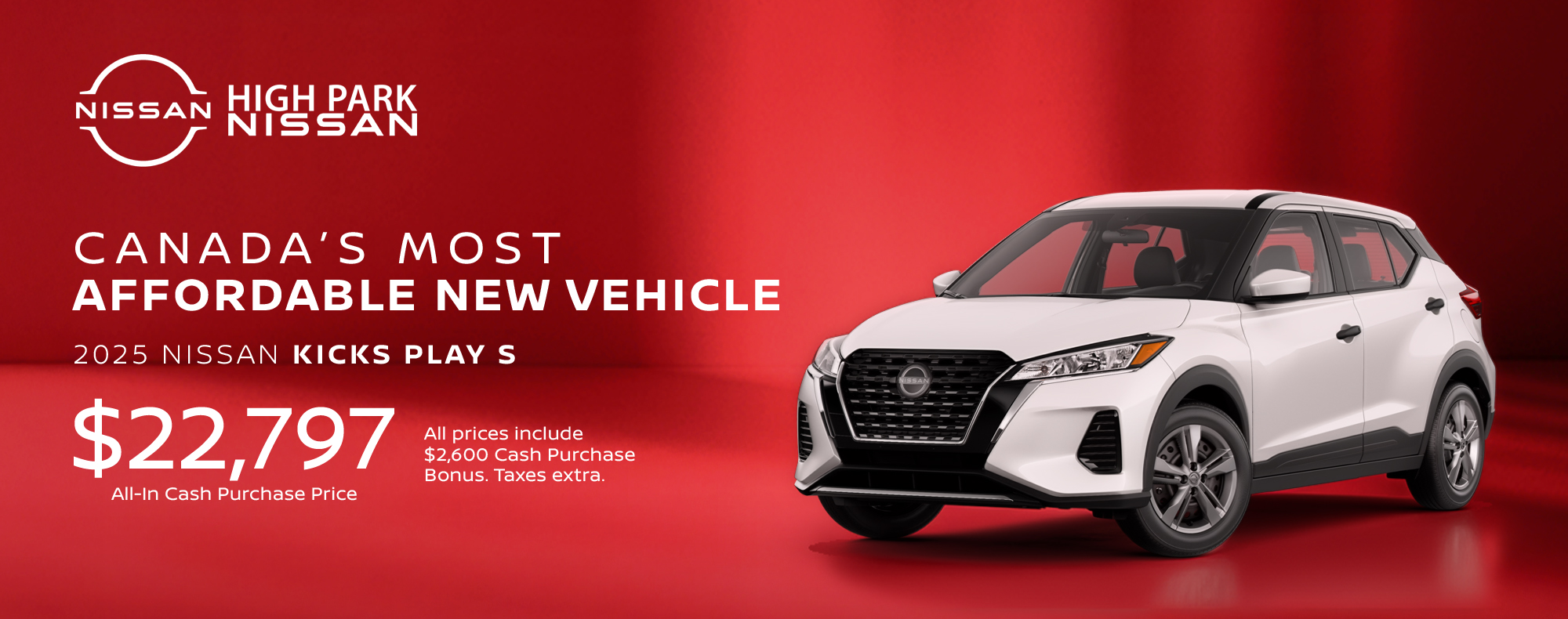 Kicks Play: [*] Offers available from February 3, 2026 to March 2, 2026. Payments cannot be made on a weekly basis, for advertising purposes only.*Representative monthly lease offer based on a new 2025 KICKS PLAY S at 3.49% Interest Rate (6.95% Effective APR) for 48 months equals monthly payments of $ 296 with $ 3095 down payment, and $0 security deposit. Lease based on a maximum of 16,000 km/year with excess charged at $0.10/km. Total lease obligation is $ 17,398. Lease Bonus of $ 0 is included in the advertised offer.License, registration, insurance and applicable taxes are extra. Offers are available on approved credit through Nissan Canada Finance for a limited time, May change without notice. Retailers are free to set individual prices. Vehicles and accessories are for illustration purposes only.